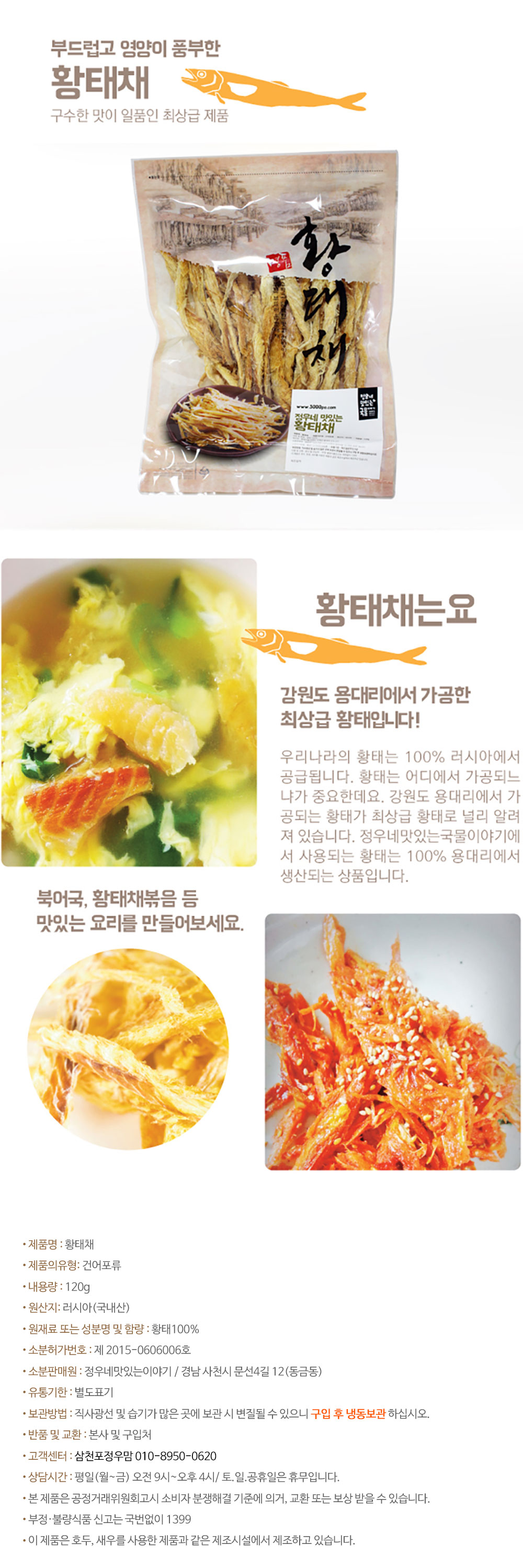 ✅ 100% 황태 사용 – 믿을 수 있는 원재료 ✅ 쫄깃하면서도 부드러운 식감 – 아이부터 어른까지 부담 없이 ✅ 영양 가득 – 고단백 저지방, 건강한 간식·안주로 딱! ✅ 손질 완료 – 바로 꺼내 간편하게 조리 가능 🍲 황태국 : 속이 풀리는 시원한 국물맛 🥗 황태무침 : 새콤달콤 입맛 돋우는 밑반찬 🍺 황태구이 : 맥주·소주와 최고의 궁합 🍱 간식·영양식 : 아이들 건강간식으로도 GOOD